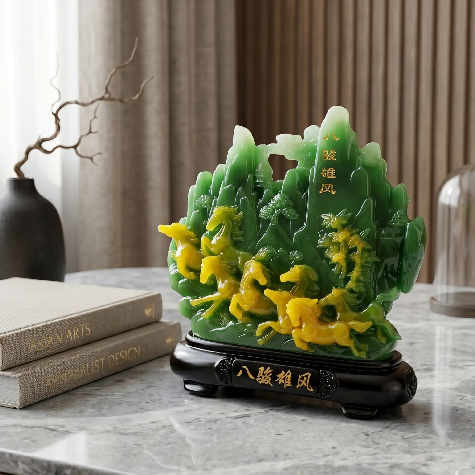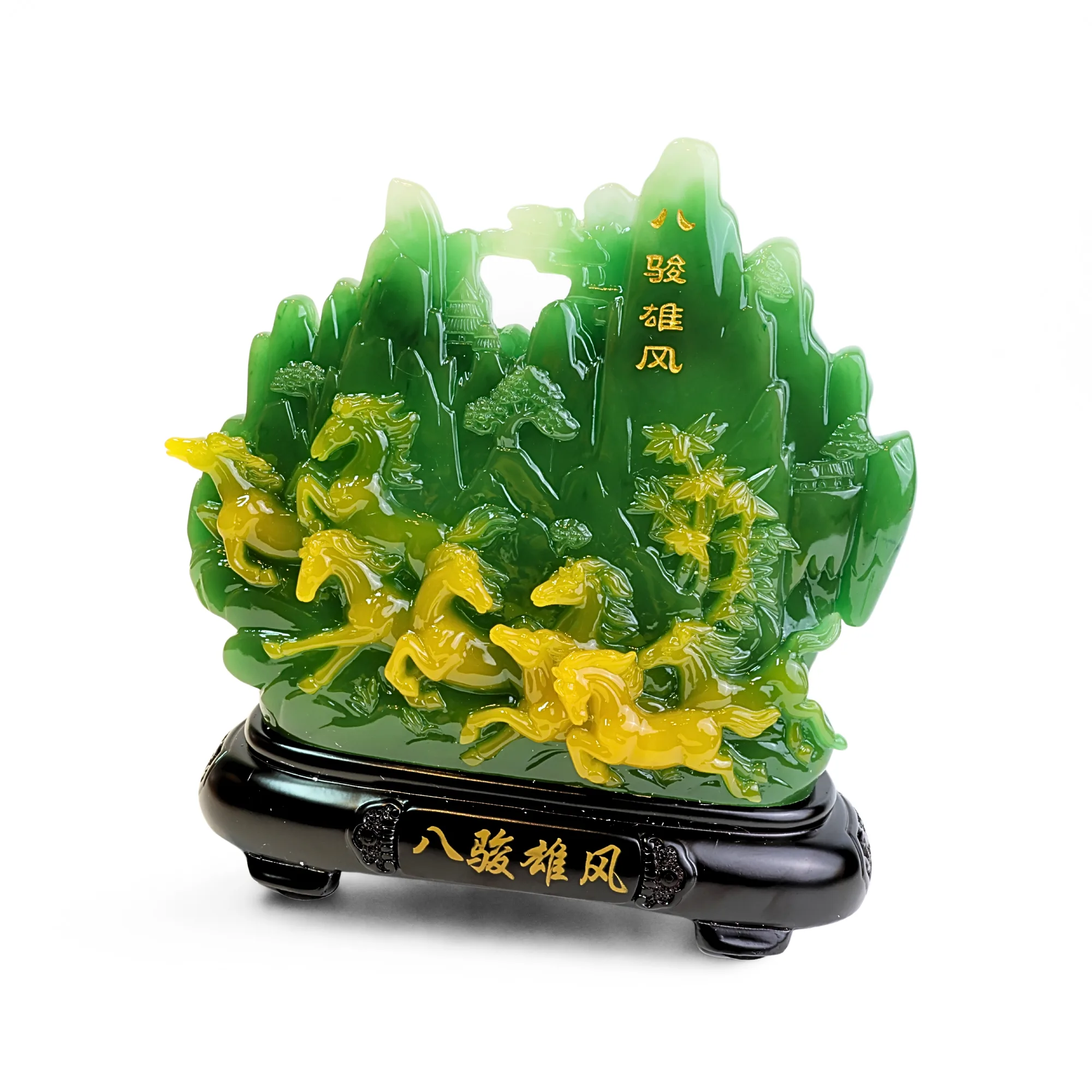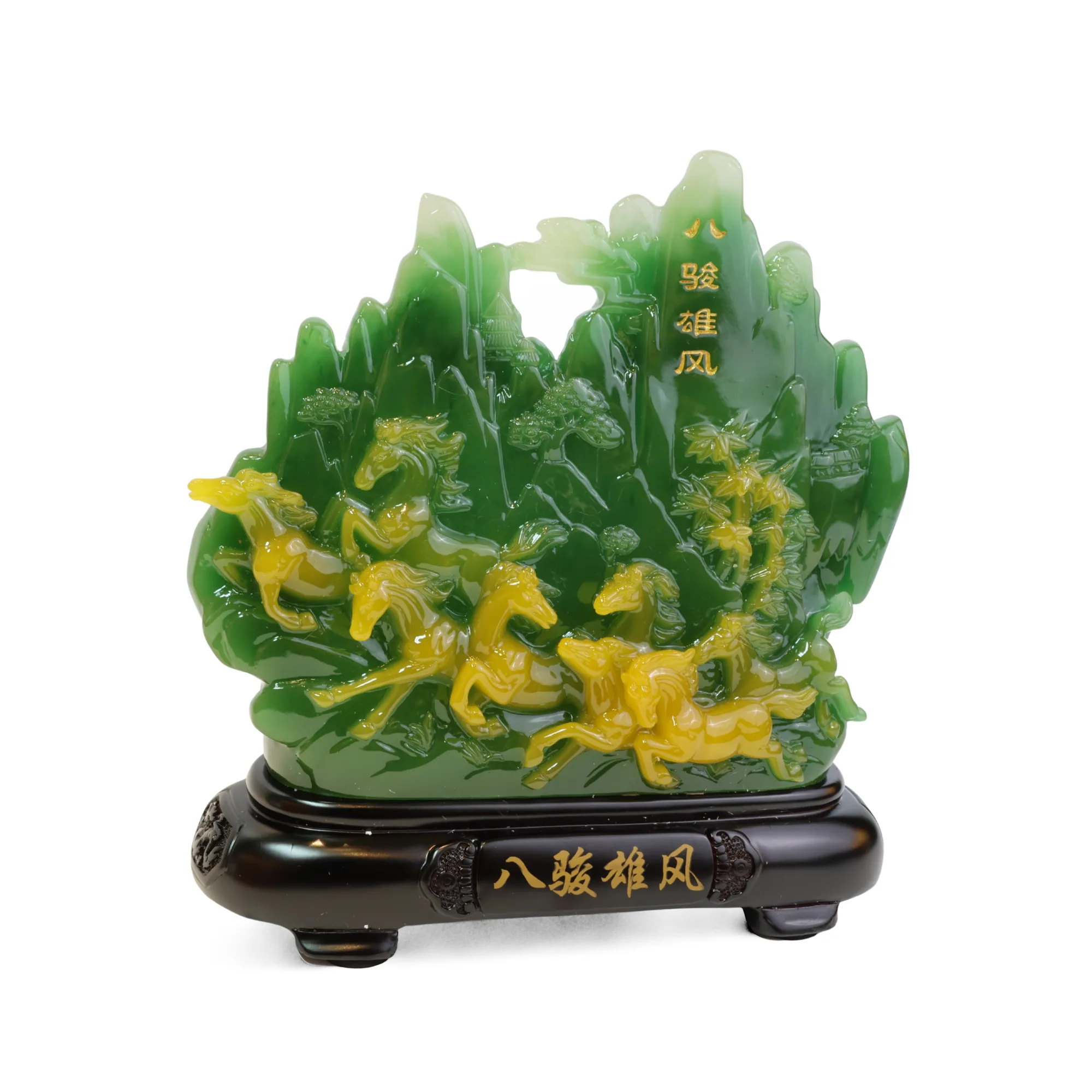Highlighted on this home decoration statue are the eight golden running horses, walled by a victorious jade mountain. Eight horses are bound to give the owner fame, recognition, success, and promotion in one's chosen work or career. With a well-founded jade wall, the horses' power will not fall and will continue to give you swift success. This is perfect for achieving glamorous triumphs in your work. Have one and test its promised gifts!