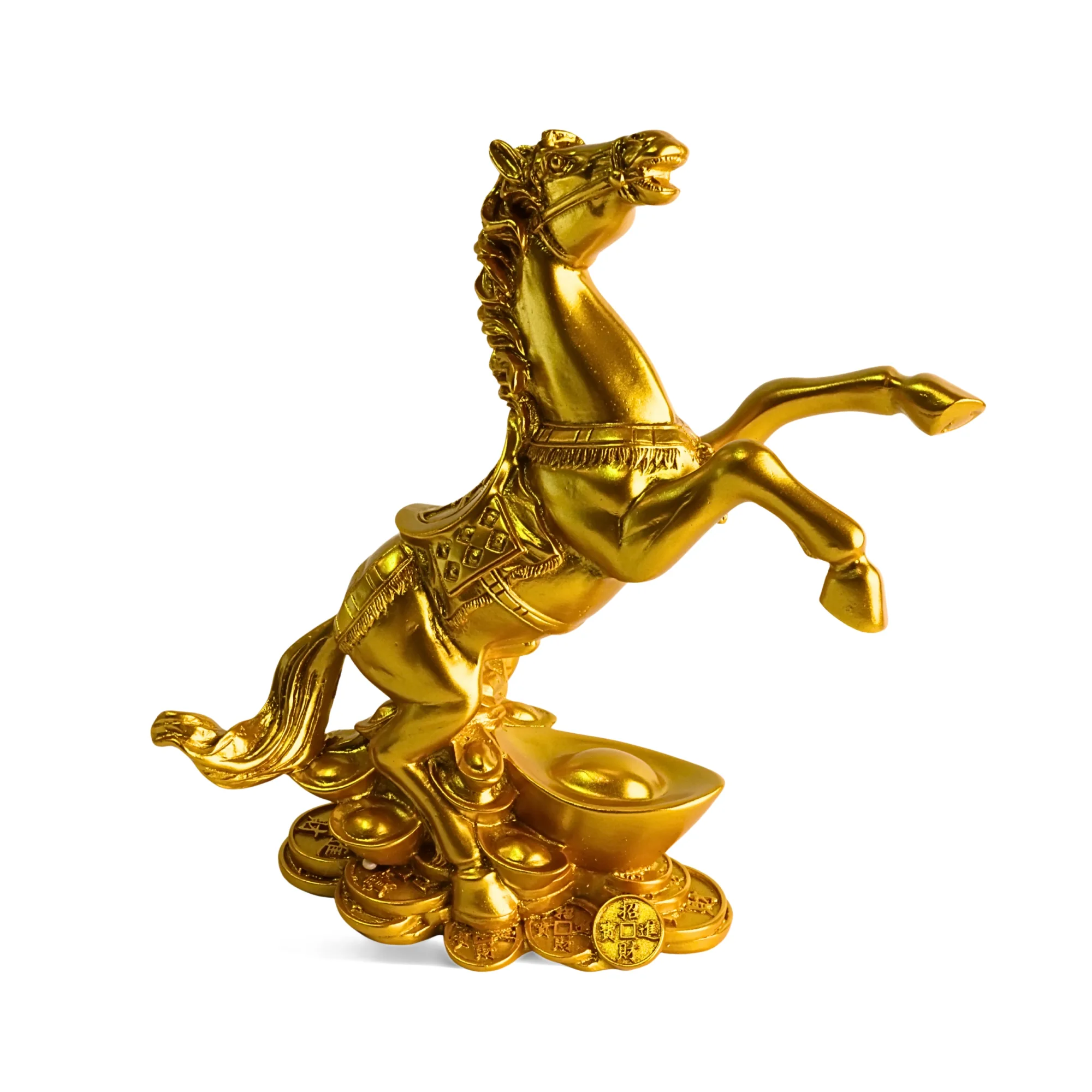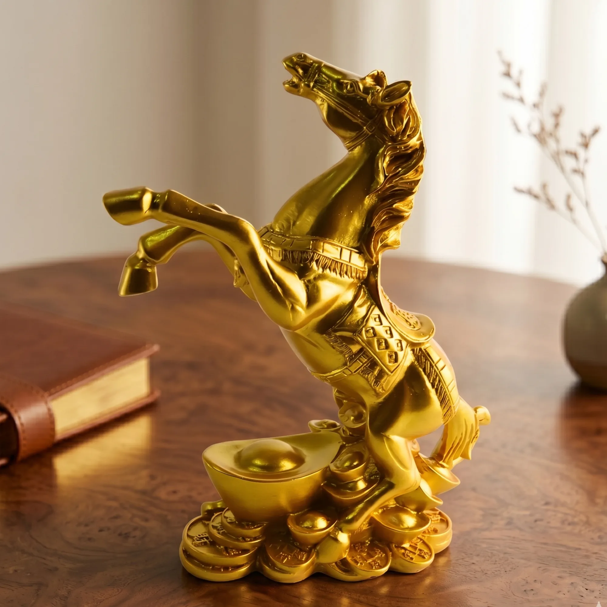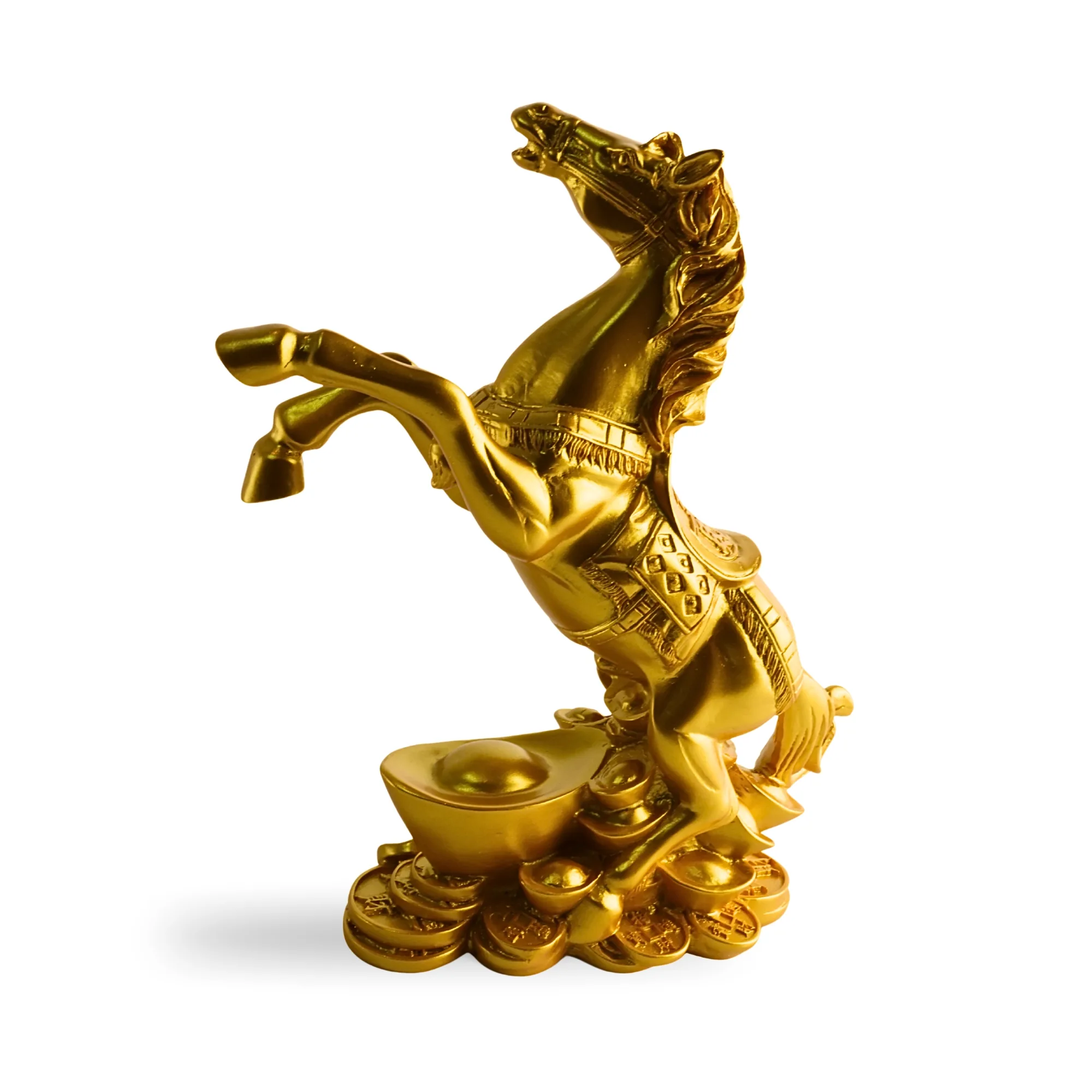 This horse glazed in gold is depicted standing on a pot surplus with wealth and piles of gold ingots ready to provide hasty wealth luck in life! Horses are also associated with victory, particularly running horses, and the horse standing on the wealth pot, in a running motion, makes your path victorious. Every step it takes bears fruitful money and success, so placing this in your house and store attracts wealth.